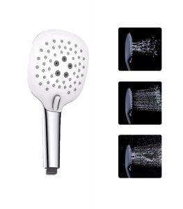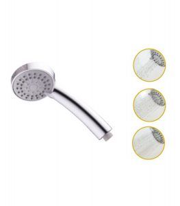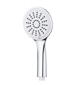 - Miño.- Acabado en blanco/cromo, sistema antical, diseño semicircular, las posiciones se cambian mediante botón y son: lluvia intensa, espuma “sfot” y lluvia+espuma. Diámetro del cabezal 11 cm aprox.