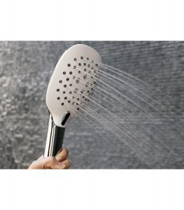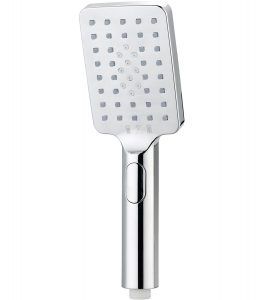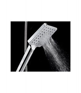 - Ter.- Acabado en cromo, sistema antical, diseño cuadrado, posiciones: lluvia intensa, espuma “soft” y lluvia+espuma, botón intercambiador. Cabezal cuadrado : 8 cm x 12 cm.