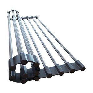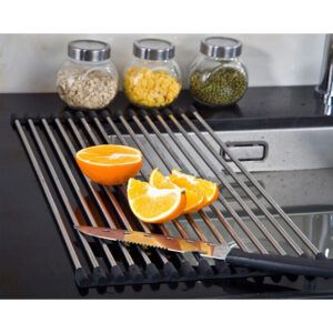 Fabricado en acero inoxidable. Múltiples usos. Se adapta a fregaderos estándar. 19 barras. Goma lateral color Negro. Se suministra en blister expositor. Medidas: Ancho: 48 cm   Alto: 35 cm