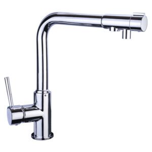 Fabricado en latón. Montura cerámica. Doble función. Maneta con cartucho salida agua fría/caliente. Eliminando el contacto del agua con el aire para así evitar su contaminación. Maneta en el caño con montura salida de agua fría filtrada. Sistema de filtrado no incluido Se suministra en caja