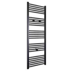 Fabricado en Acero. Lacado en Negro. Radiador secatoallas de circuito de calefacción. Incluye tapones, soportes y purgador.Juego de llaves bitubo incluidas. 321 kcal. Consulte con un profesional para su instalación. Disponible también en 50cm de ancho. Adecuado para espacios más reducidos.