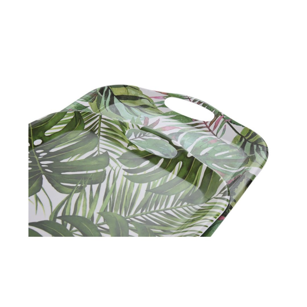 Fabricada en melamina con diseño de hojas verdes y asas para llevar mejor