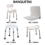 Asiento ABS blanco con respaldo ABS. Patas antideslizantes. Regulable a 6 alturas. Patas en aluminio numeradas. Hendidura para colocar el mango de ducha. Peso máximo 110 kg. Se suministra en caja con asa.
