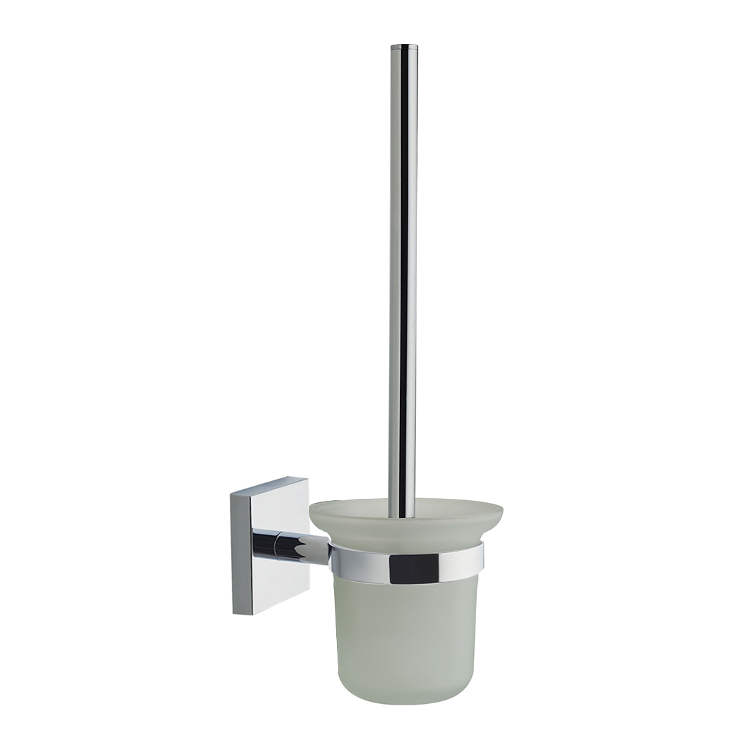 Escobillero de Pared fabricado en acero inoxidable con el vaso de cristal. Instalación con tornillos. Embellecedor con diseño cuadrado. Se suministra en caja expositora.
