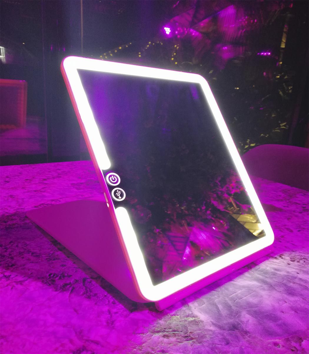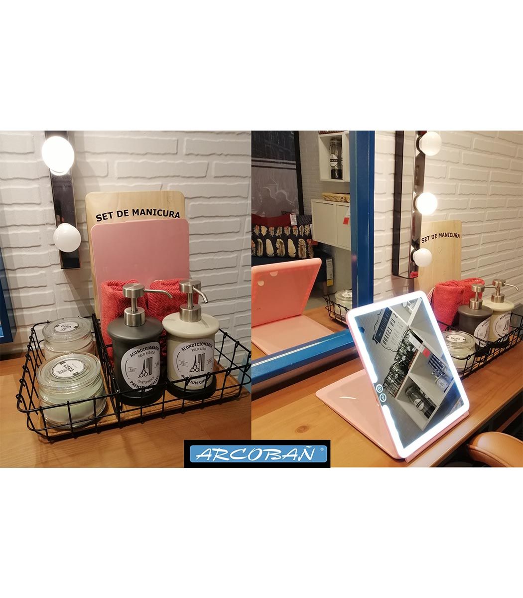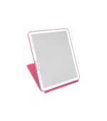 Espejo sobremesa con luz LED. Perfecto para llevar de viaje. Botón de encendido touch. Intensidad de la luz regulable. Cable de carga USB incluido (olvídate de las pilas). Diseño tablet extraplano. Color rosa. Se suministra en caja.