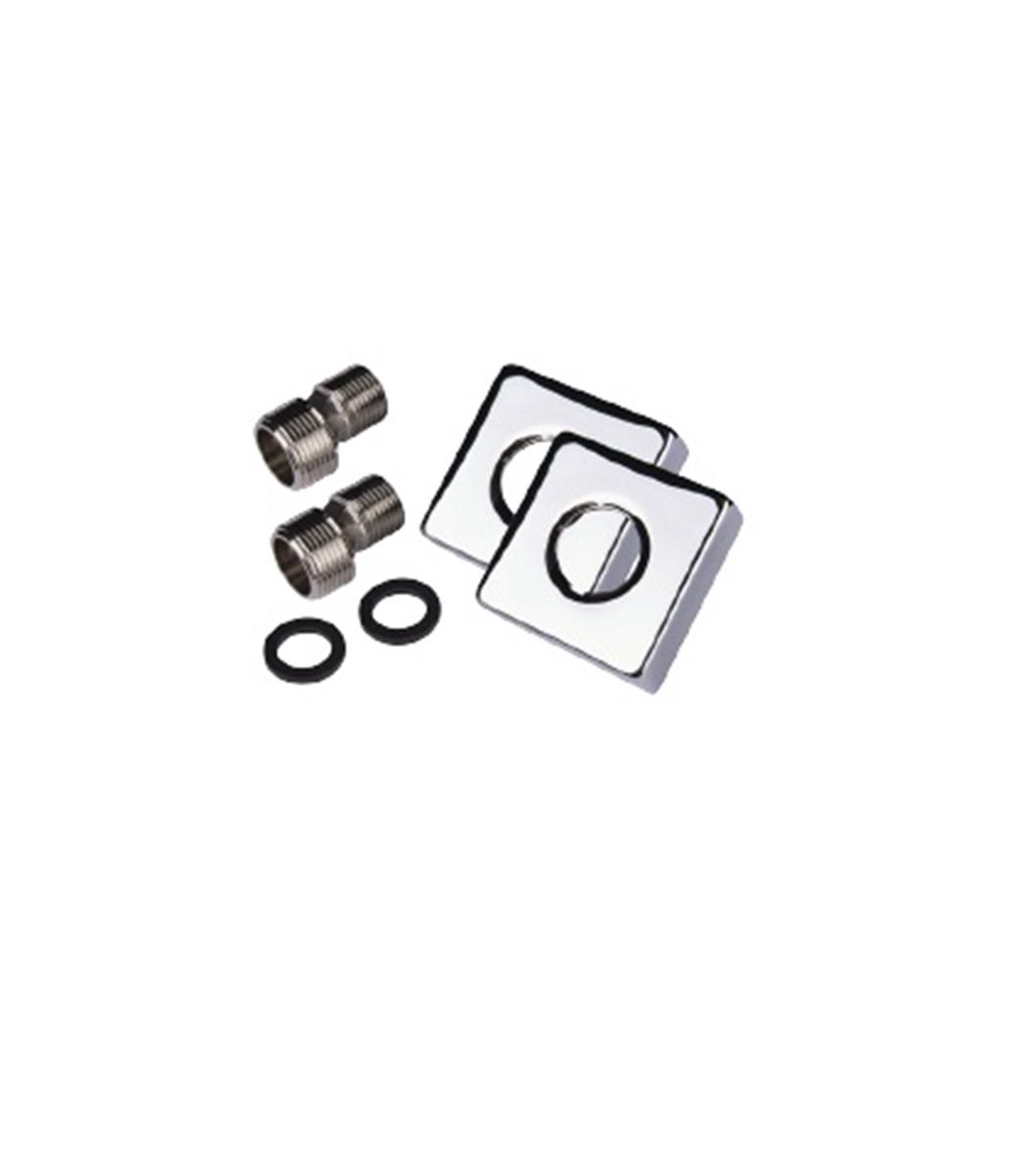 Fabricadas en latón. Incluye juntas de goma. Diseño cuadrado. Presentación en blister. Medida embellecedor: 6cm x 6cm