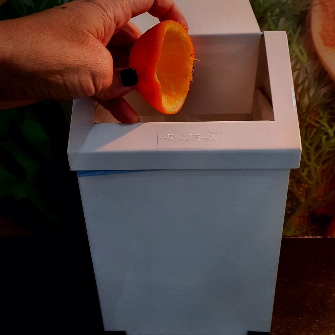 Fabricado en inox. Acabada en blanco. Ideal para poner en la cocina como papelera de residuos orgánicos. Se puede poner sobre la encimera dado el tamaño. También para el baño.