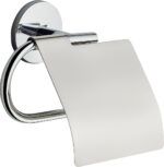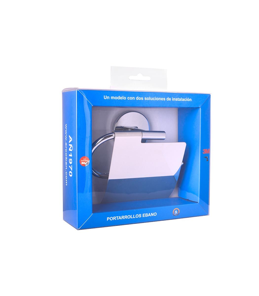 Portarrollos fabricado en acero inoxidable. La instalación puede ser con tornillos a la pared o con adhesivo. Embellecedor con diseño circular. Se suministra en caja expositora.