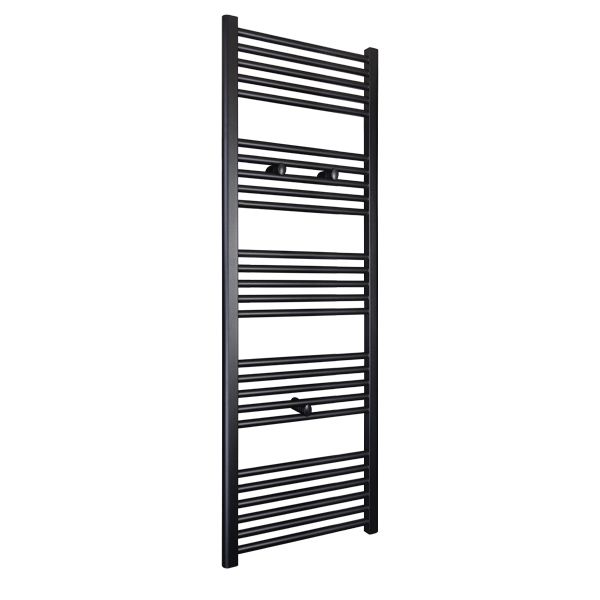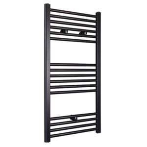 Fabricado en Acero. Lacado en negro. Radiador secatoallas de circuito de calefacción. Incluye tapones, soportes y purgador. Juego de llaves bitubo incluidas. Consulte con un instalador profesional para su instalación.