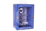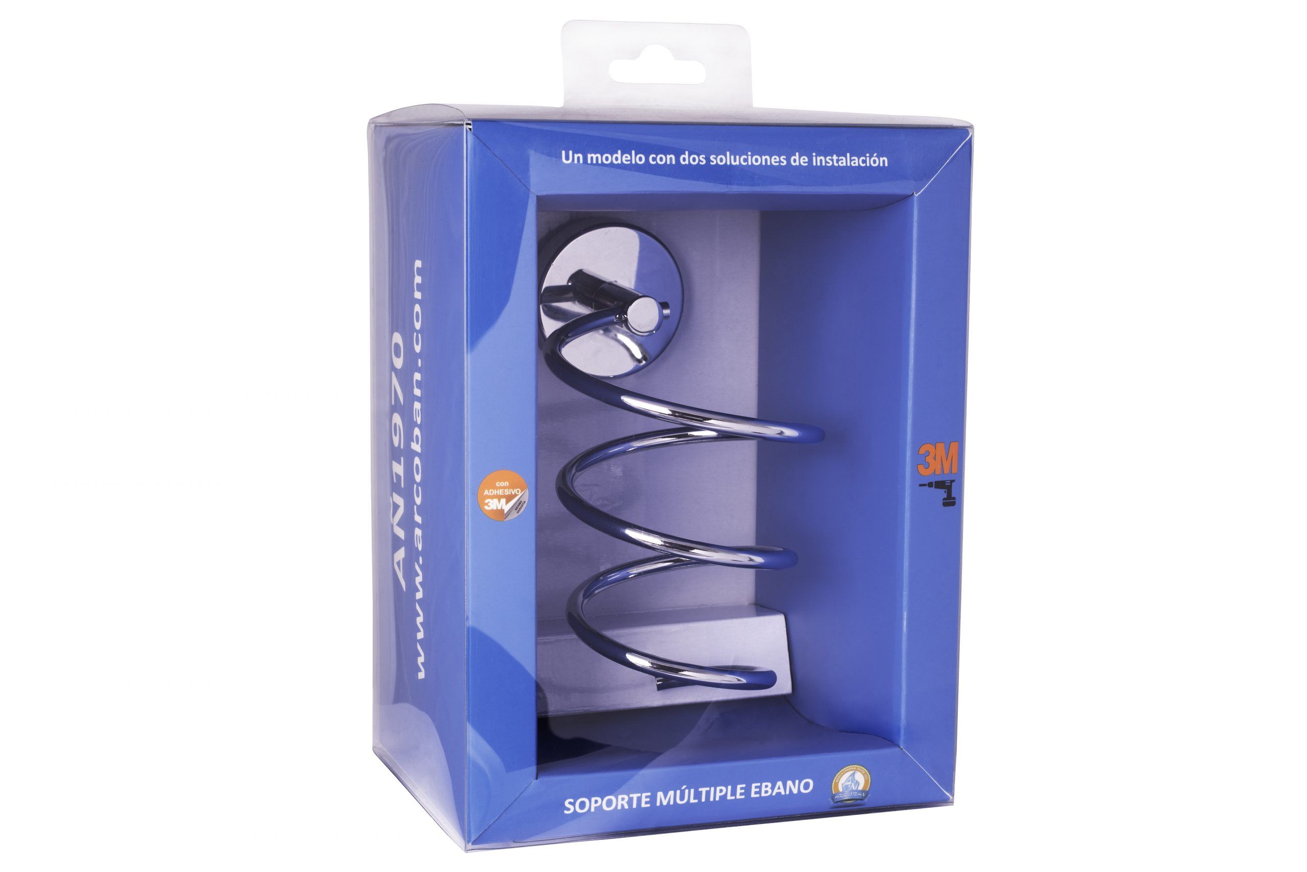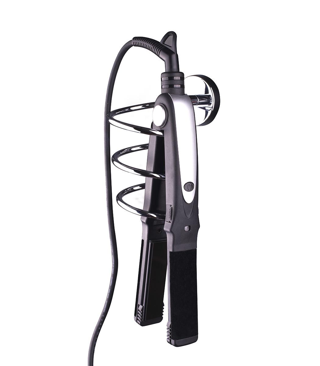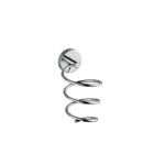 Soporte múltiple fabricado en acero inoxidable. Para colocar secadores, planchas de pelo, rizadores… La instalación puede ser con tornillos  o con adhesivo. Embellecedor con diseño circular.  Se suministra en caja expositora.